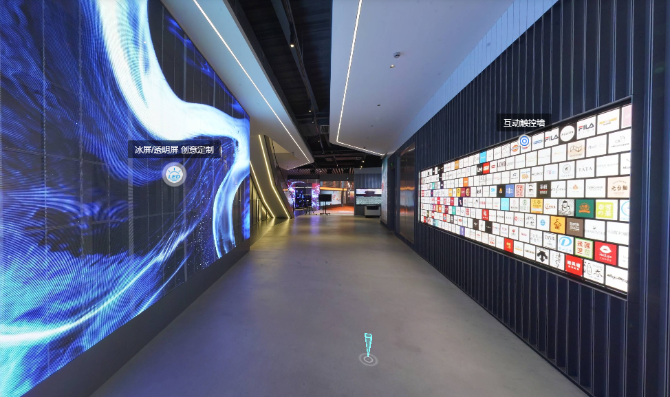 觀眾可以第一視角沉浸式漫游體驗展廳場景,身臨其境的感受展廳環境,查看展項與展品。虛擬展廳內所有展項、展品均進行了名稱標注,且集成產品資料、方案、案例、視頻介紹等內容,觀眾可點擊查看,自助參觀。