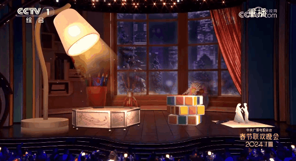 一襲白衣、一支麥克風,任素汐溫柔吟唱《枕著光的她》,整個舞臺被塑造成一張巨大的窗前書桌,利亞德旗下數虎圖像運用虛擬制作和AR技術在臺面上擺放了各種老式精致桌面擺件,臺燈、八音盒、魔方、鋼筆以及跳舞的瓷娃娃等,舞臺側屏幻化成錯落排列的書籍,巧妙又生動,展現著生活中細微而真切的美好情感。