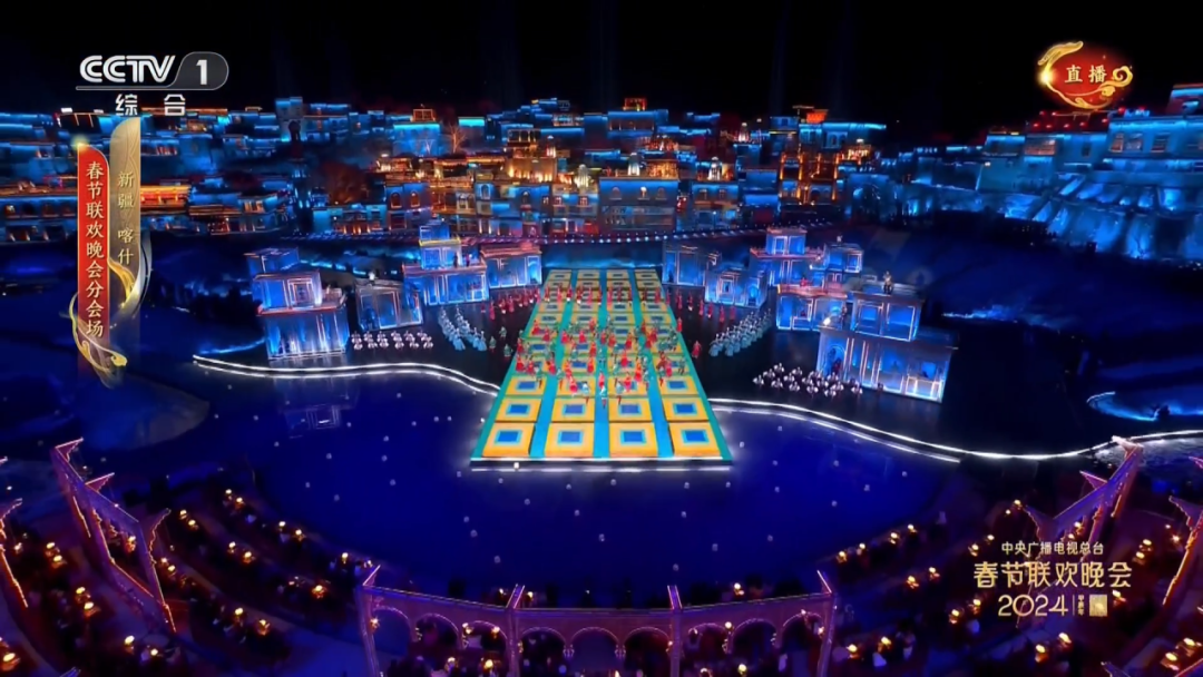 新疆喀什分會場繼續歡歌起舞,在利亞德1000多平LED顯示產品及30UHD4K40投影機助力打造的絢麗多彩的舞臺中,用《爺爺的薩瑪瓦爾》曲目展示美好生活。
