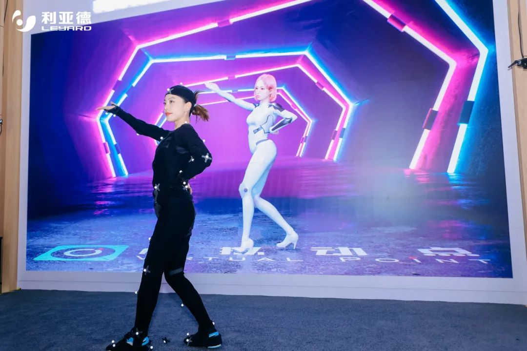 展會現場,利亞德虛擬動點架設了8臺OptiTrack空間數據采集攝像機,借助空間計算自研軟件,通過AI算法對動捕演員的身體動作進行識別、分析形成骨骼數據,傳輸至引擎算力工作站,實時驅動自研高仿真數字人形象,為大家獻上一場場數字人“大秀”,引來眾多行業專家駐足洽談。