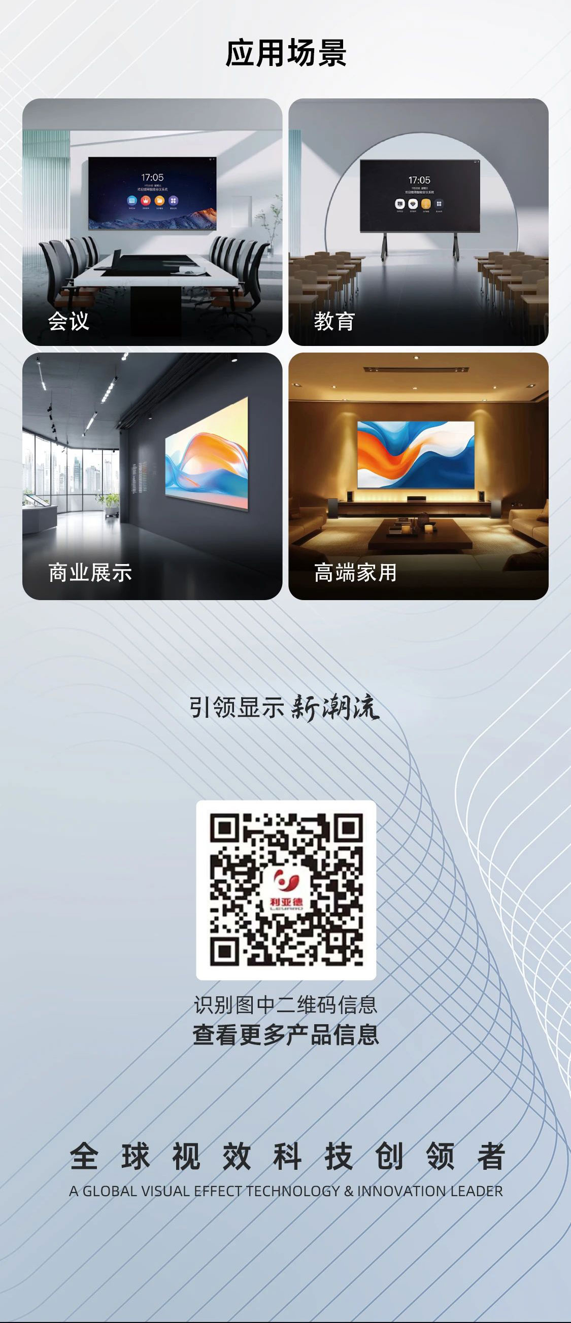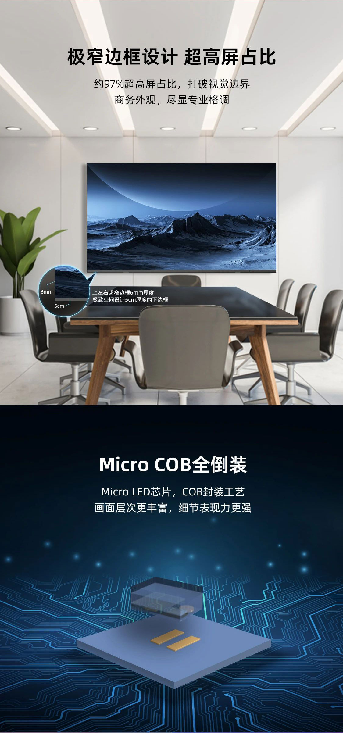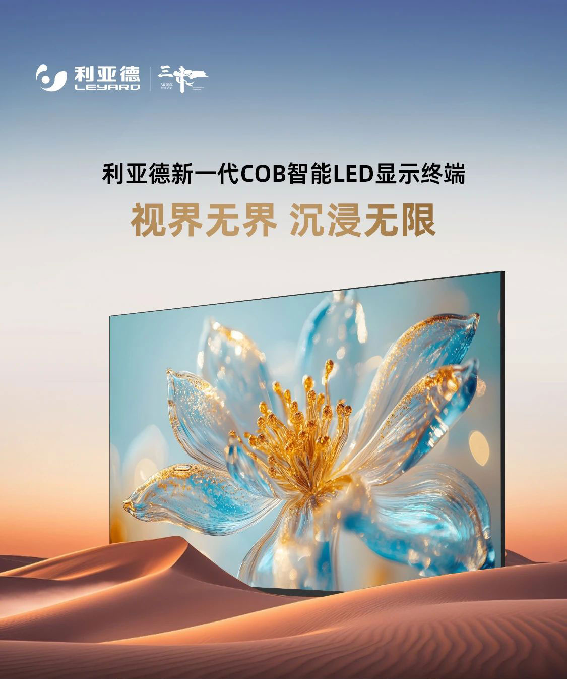 利亞德新一代COB智能LED顯示終端,采用先進的COB封裝工藝,色彩表現卓越,呈現細膩逼真的畫面效果,其“All-in-One”高度集成設計及窄邊框、超高屏占比,打破視覺邊界,滿足會議、教育、商業展示及高端家用等多種空間場景需求。